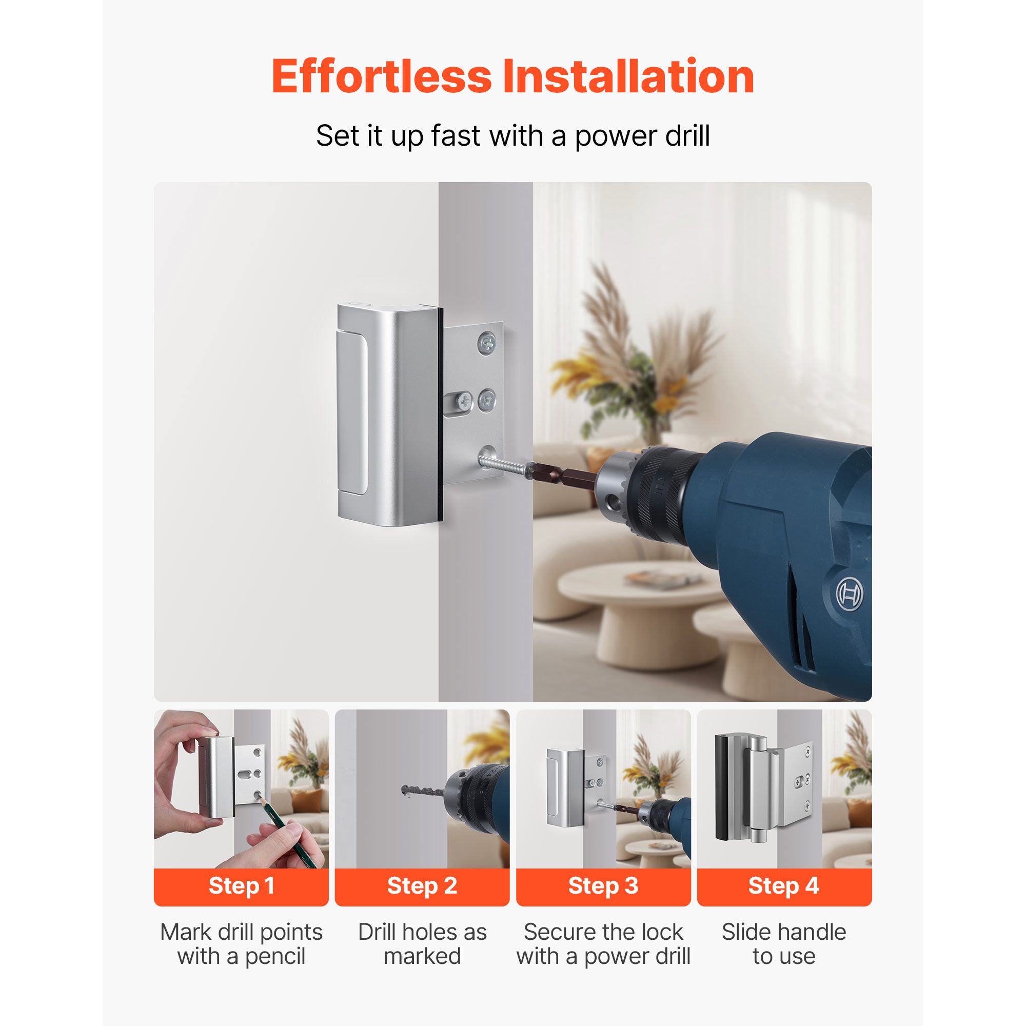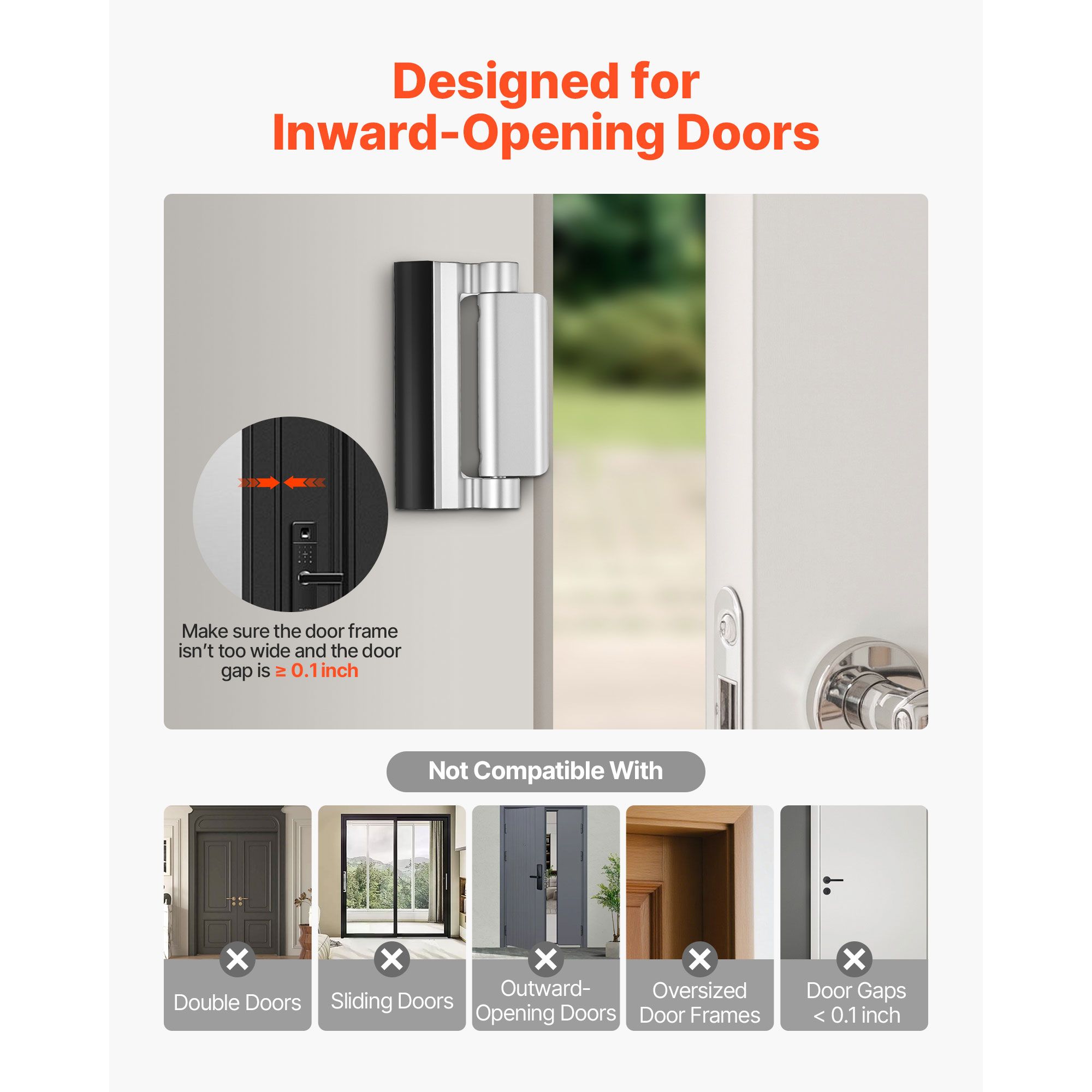 Our security locks for doors inside are compatible with apartment doors, bedroom doors, front and back doors, and even patio doors. Whether you live in an apartment, villa, or standard home, this lock is easy to install and provides strong reinforcement for your doorway.